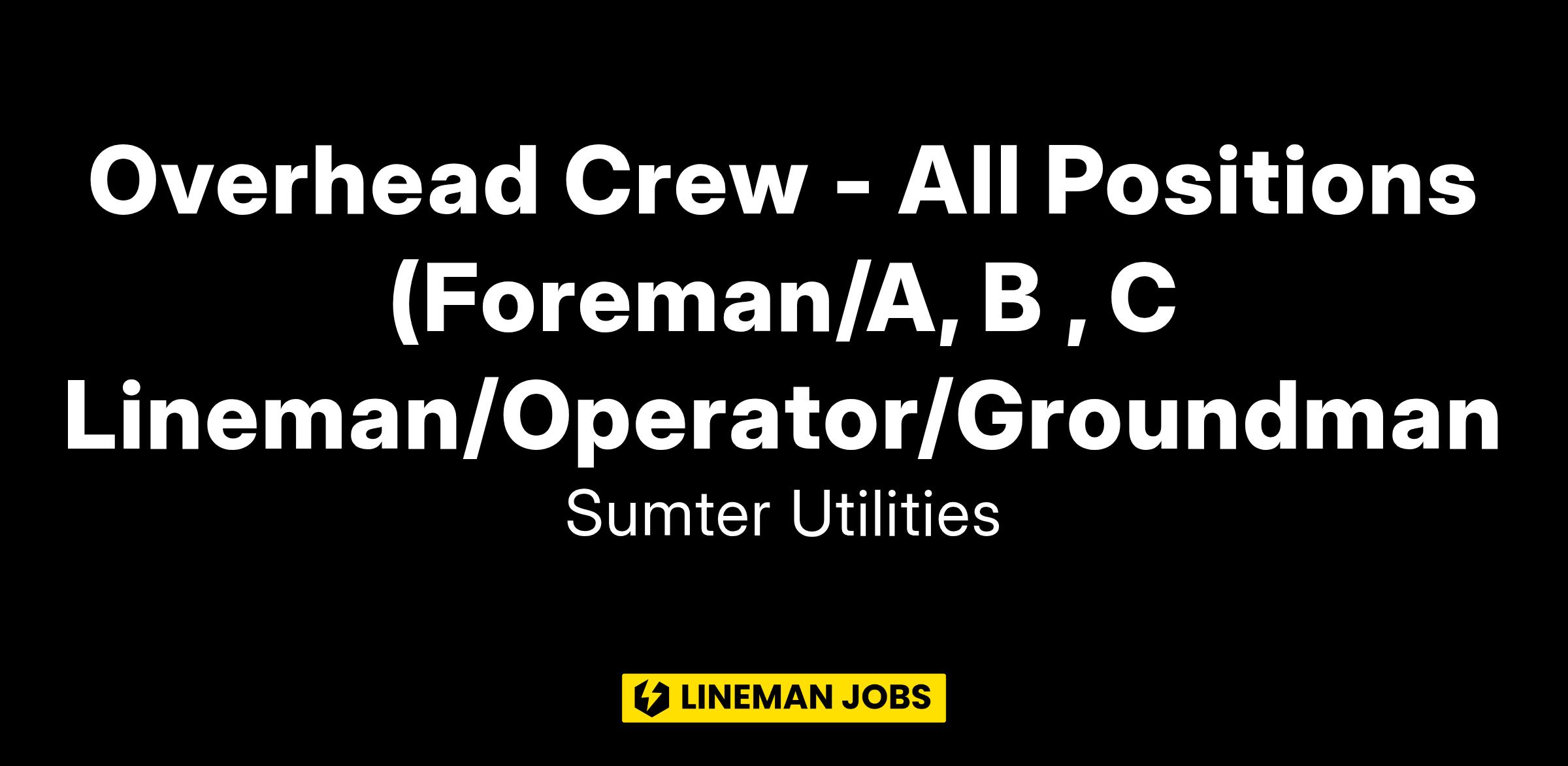 Sumter Utilities, Inc. (a Quanta Services company) seeks multiple Overhead Crews (Foreman/A Lineman/B Lineman/C Lineman/Operator/Groundman).