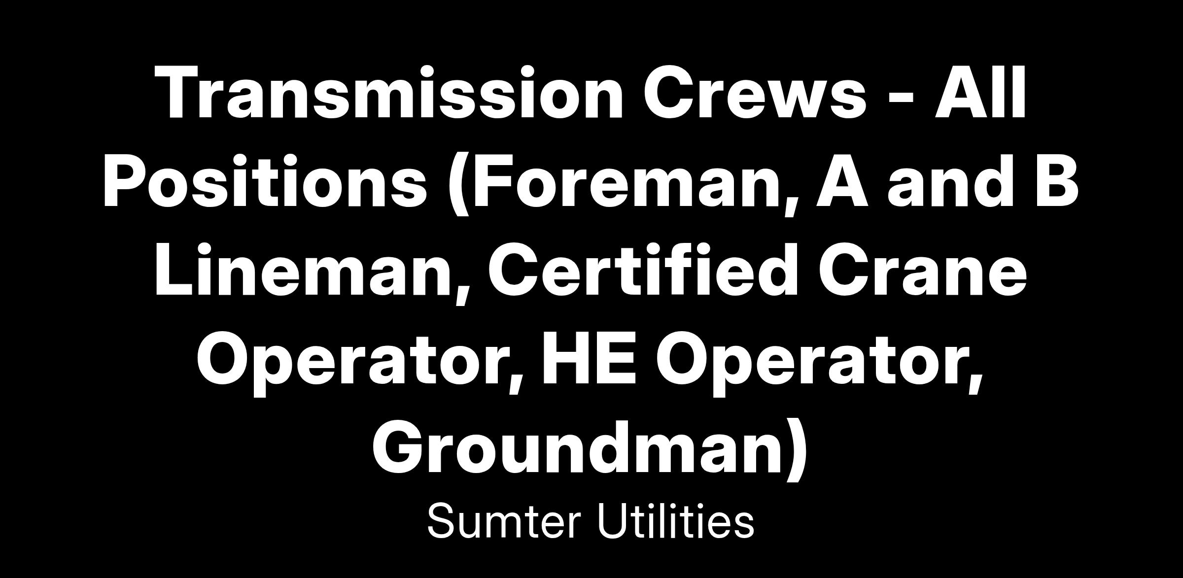 Sumter Utilities, Inc. (a Quanta Services company) seeks Transmission Foreman, A and B Lineman, Certified Crane Operators for Georgia Power and Georgia Transmission Corporation.