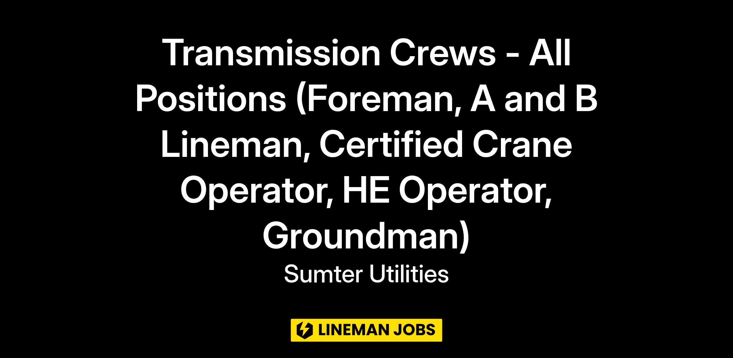 Sumter Utilities, Inc. (a Quanta Services company) seeks a Transmission Crew (Foreman, A, B, C Lineman, Certified Crane Operators, HE Operators).
